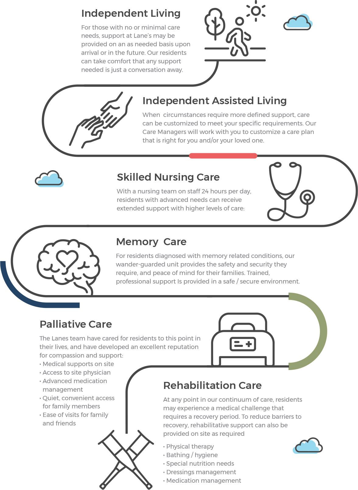 Lane’s continuum of care ensures that your Lane’s home can be your forever home, with familiar surroundings, friendly neighbors and caring, professional support throughout any health challenge. We work with new residents to determine appropriate supports from day one, and should circumstances change in the future, we ensure that the supports and the levels of care are adapted to address the evolving need.